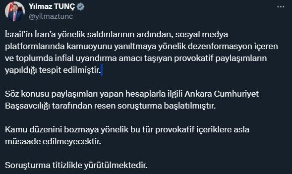 Bakan Tunç, paylaşımda şu tabirlere yer verdi: “İsrail’in İran’a yönelik akınlarının akabinde, toplumsal medya platformlarında kamuoyunu yanıltmaya yönelik dezenformasyon içeren ve toplumda infial uyandırma emeli taşıyan provokatif paylaşımların yapıldığı tespit edilmiştir. Kelam konusu paylaşımları yapan hesaplarla ilgili Ankara Cumhuriyet Başsavcılığı tarafından resen soruşturma başlatılmıştır. Kamu sistemini bozmaya yönelik bu cins provokatif içeriklere asla müsaade edilmeyecektir. Soruşturma titizlikle yürütülmektedir.”