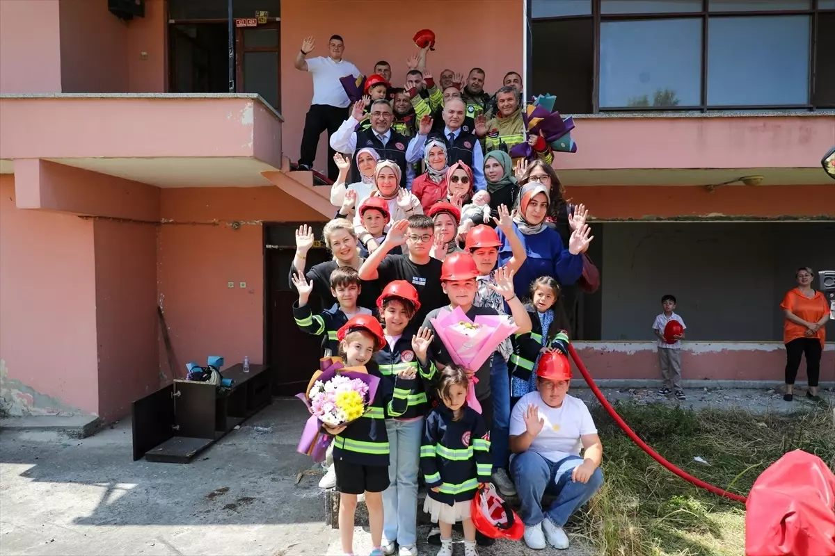 Minik itfaiyeci kıyafetleri giyen çocuklar, ellerinde çiçeklerle babalarının yanına geldi. Babalar ve çocukların buluşması his dolu anlara sahne oldu.